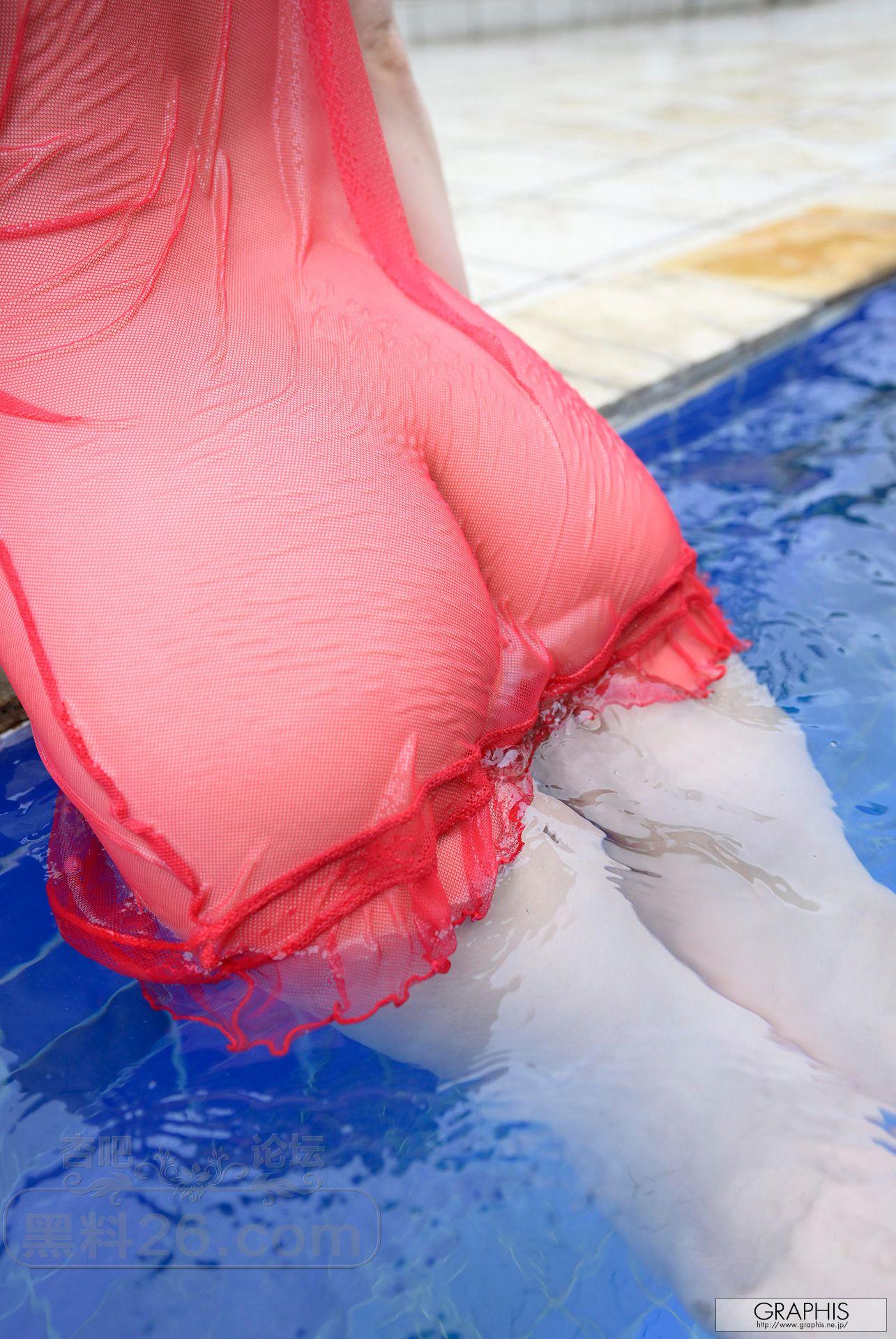 红色薄纱吊带裙短发嫩妹子户外泳池中湿身色诱【26P】