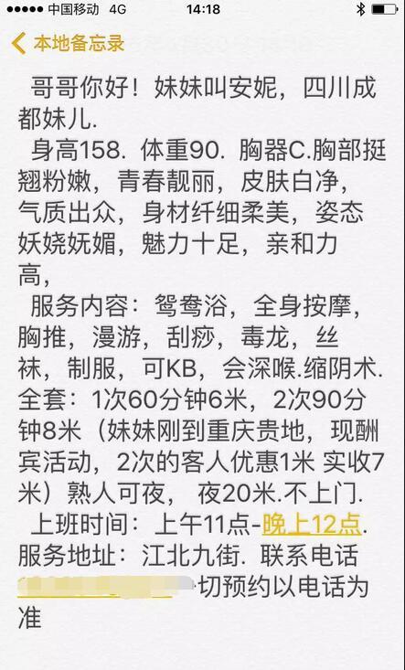 【寻欢细节】:中午,偶得朋友推荐一个兼职群,加入后就开始闲逛,看着里面大群妹子的约炮信息不间断轰炸也难免眼花,一个 上午都在不停的看美胸美图。。到中午时分,我所推荐这个妹儿在群里发信息说有空待客了,看头像不错,便进一步去空间查证(照片附图),当然和大家一样会有眼前一亮的感觉,所以第一时间通电话了,因为妹儿也写明是成都过来的,因此电话那头的声音微、甜、骚的味道中也能听出四川腔来。在电话里也没有多聊,就直接切入主题,询价、谈服务、约时间,并再三确认必须是本人,否则走人。在一切妥当过后,便按妹妹指点去江北同创国际小区。。。在小区外再次电话,确认了楼栋、楼层,心急的串了上去,下电梯立马拨通电话喊妹子来接,这个过程实在不好受,因为想着马上就能享受到一个漂亮妹儿的全套服务并且抱住她的头给我口交,实在是太爽了,因此等她来电梯口接我的时候还左顾右盼,担心来个不对口味的。。。 不多久,妹子出来了,一身夜场装扮,脸上也没有明显的画妆,估计是刚起床的原因(因为我联系的时候正好约到她当天第一个服务),第一印象不错,和照片差不多,只有感觉真人有那么一点点的出老,肤色在楼道里也分不太清,但浑圆的胸部再怎么也是遮不住的,所以整体感觉很棒(各位自行看照片)。一随妹儿进入房间就开始燥动了,准备直接脱衣服干一炮再说,可妹子估计是怕不干净,在脱衣服的同时轻声说:”哥,我先去给你洗一下吧“,我也就稍微克制了一下燥动,心想去浴室正好验证一下妹儿了身材,并体验一下配套服务。果然,妹儿光着身子进到浴室的时候那身材,怎么说呢,人虽娇小,但水雾里透过的光滑的皮肤、C杯往上的奶子和说话间透露着的骚情,那感觉,简直了。在浴室里我家伙就起来了,妹子用胸给我揉家伙的时候我顺势双手半按半抱妹儿的头就开始KJ,妹子也没含糊,不一会儿各种浪声就出来了,如果不是想着过一会要在床上大干500回合,我估计当时我就直接KB了(KB服务也有,不过计一次服务费)。三下五除二洗完就到床上体验服务,过程就不描述了,这些套路大家都懂,关键就是看妹儿的服务水平、专业技能和职业素养,此妹子中等吧,不算机车也不催,感觉她也在享受这个过程的。 几个流程下来精虫早已按捺不住,所以立刻翻身男上女下体位,戴好套直接插,插,插。。。。。在这里值得一提的是妹儿貌似有特殊技能,我在抽插的间歇明显能够感觉到弟弟在妹子阴道里面的压迫感,一阵一阵的(难道是传说中的阴缩术),很是满足。流程也差不多了,火箭也快发射,换到个人最喜欢的推车式开整,这个体位我故意放慢了插入环节以及抽插频率,以便让那呼之 欲出的感觉多飞一会儿,可毕竟妹儿也是专业人士,在床前又是放肆的浪叫又是有节奏的迎合,最后我身体前倾在妹儿背上,并且双手捏住丰满的乳房,用全身的感觉把精华一泄而出。。。。。。。那个爽。。。姿势还保持着,保持着,哈哈,当时有一分钟,只剩妹儿的精疲力竭还有我那种很久没有体验到的感觉,那种老婆、炮友给不了的感觉。一个字,超爽。 因为感觉不错,所以休息几分钟后提枪来了第二发,就不细说。只是付费时妹儿按熟人2次800的原价优惠100。最后,700米,2发,优质体验,完成。 【图片预览】: