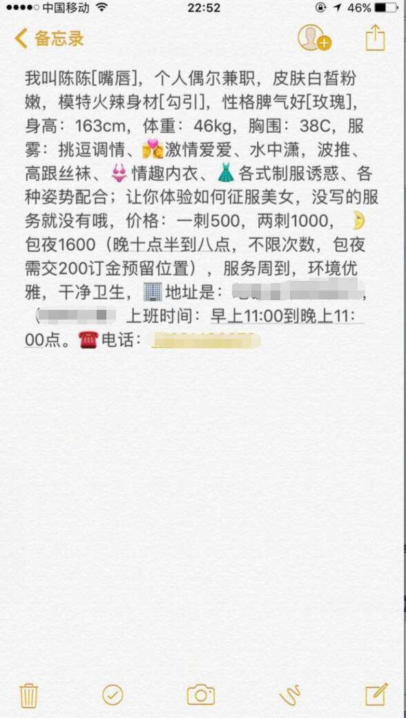 以上信息为网友分享,请在消费时自行判断谨慎消费。出现虚假信息和诈骗信息请站内短信给艾欧利雅:方法一:点击给艾欧利雅发短信——方法二:点击给艾欧利雅发短信 【寻欢时间】:2017年5月 【寻欢地点】:广州 【信息来源】:网络 【服务项目】:很多 【妹妹数量】:1 【环境设备】:该有都有 【营业时间】:下午1:00-23:00 【价格一览】:500/1 50分钟,1600包夜 【安全评估】:不去最安全 【服务星级】:80 【重点推荐】:颜值,干净,粉嫩 【寻欢细节】:网上找的资源,颜值没得说,身材小巧,很乖,配合很好,是那种一看就能硬的漂亮妹妹,96年的,嫩的出水 【总体评价】:85 【联系方式】: 验证截图: